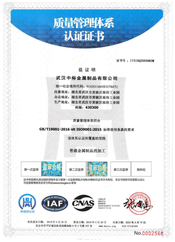 武漢中裕金屬制品有限公司(以下簡稱公司)成立于1996年8月,民營私人獨資企業(yè)。2010年8月投資1800余萬元,在前川油崗工業(yè)園征地20畝,新建5000平方米的生產(chǎn)車間和1100平方米的辦公大樓,2011年8月全部峻工投入使用。